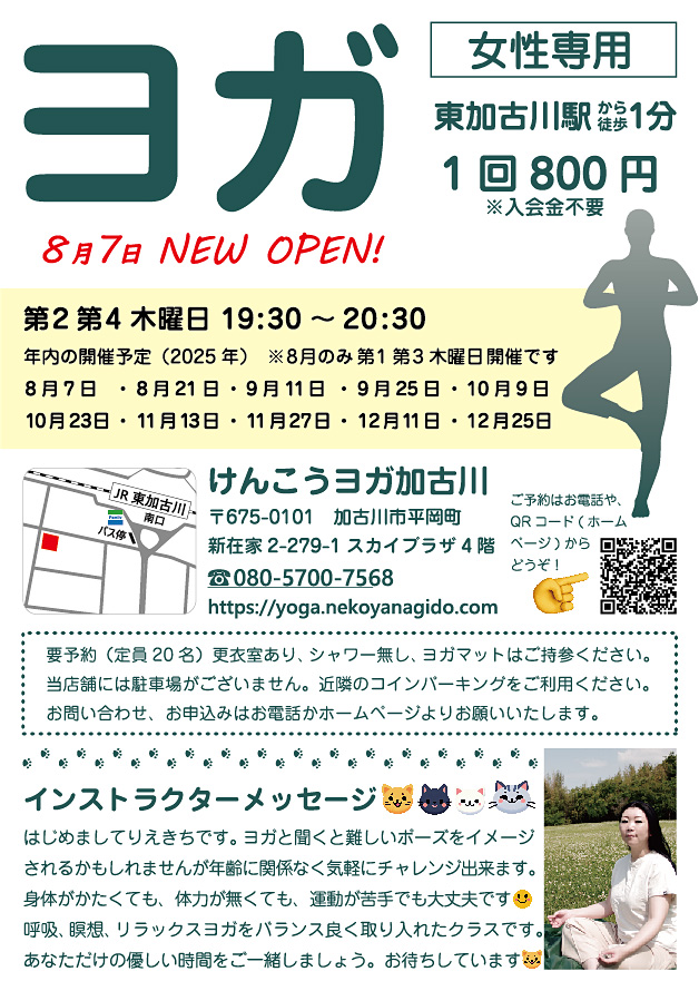 2025年8月7日、兵庫県東加古川駅前にヨガスタジオオープンしました。